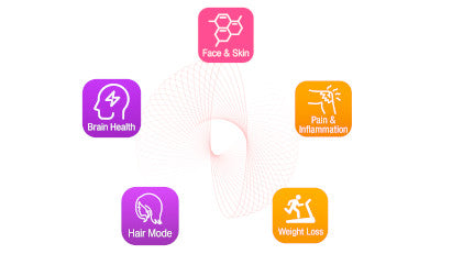 Includes Face & Skin, Pain & Inflammation, Weight Loss, Brain Health, and Hair. Each mode is designed from validated human trial data for effective application.